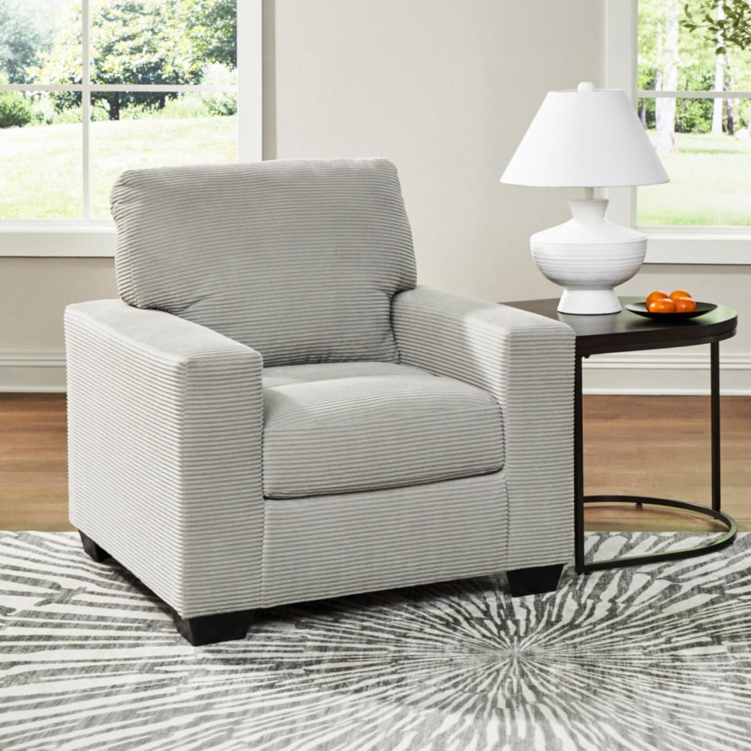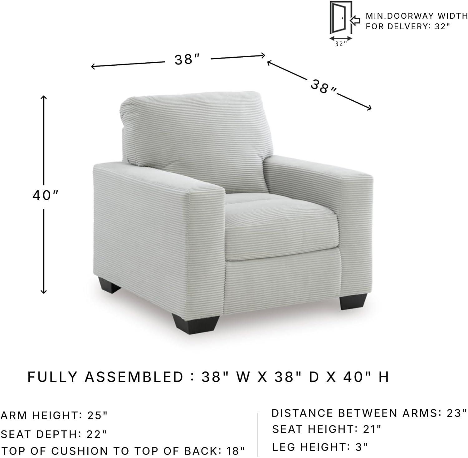 The crisp neutral hue and striking design details of this chair create a living room that expertly reflects your modern taste. For irresistibly cool textural appeal, the ultra-soft fabric is enhanced by a small-scale corded look. With a clean-lined silhouette complete with track arms, this chair allows you to take a trend-right approach to everyday living.