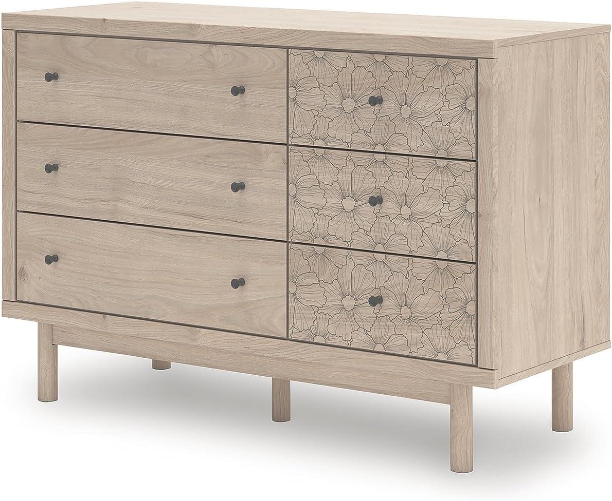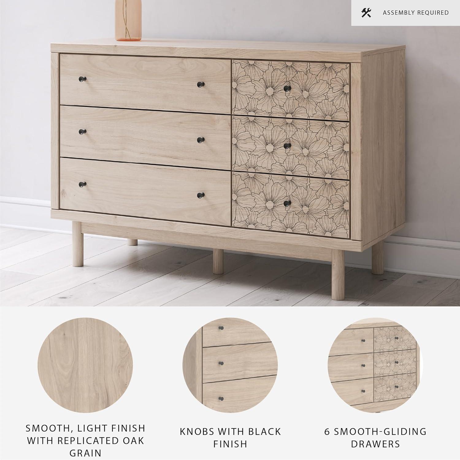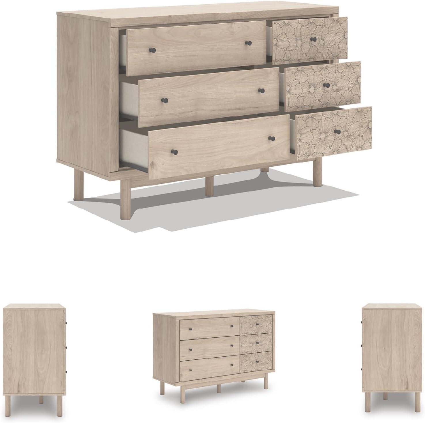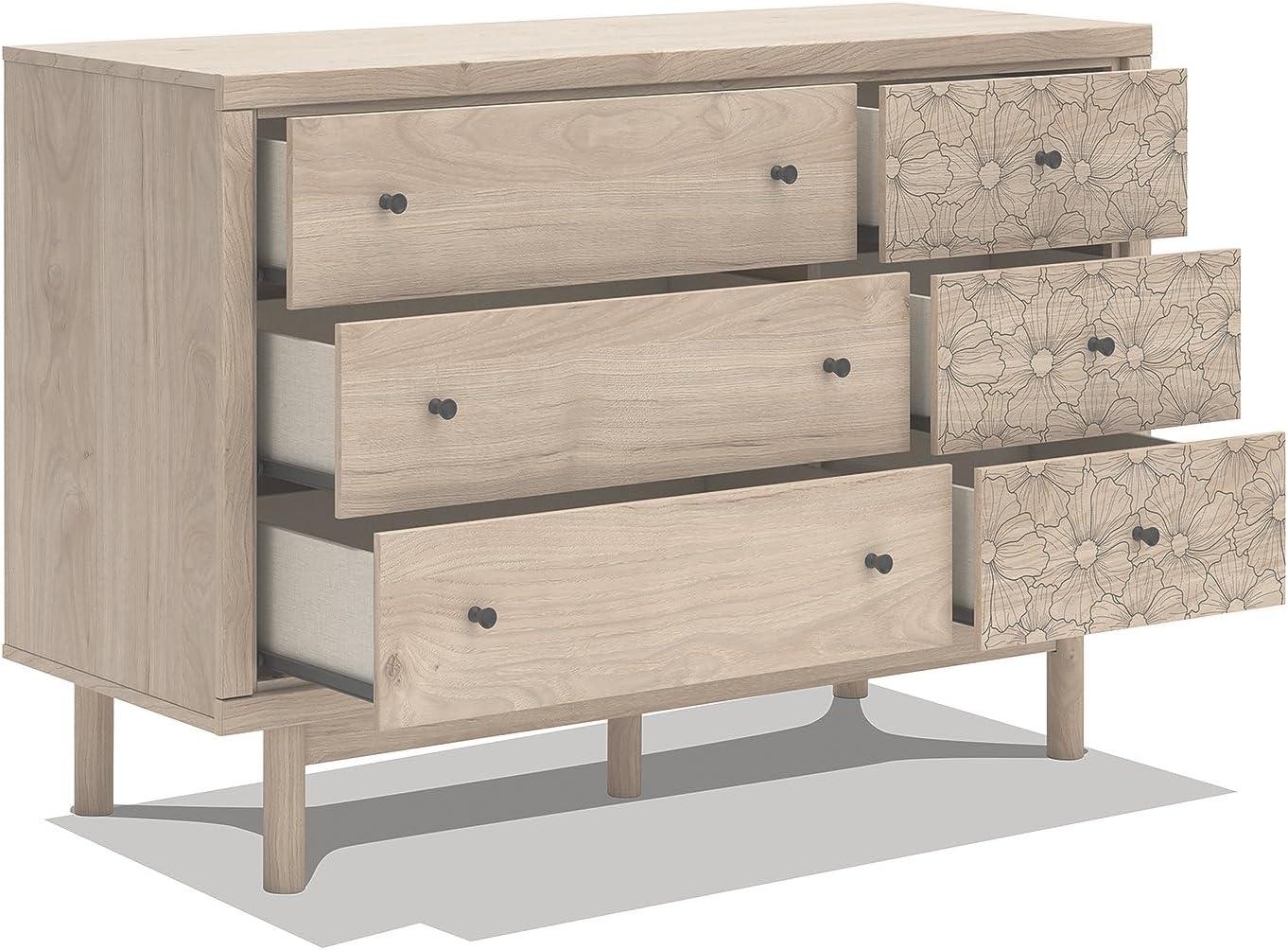 Signature Design by Ashley Birkmore Mid-Century Modern 6-Drawer Dresser with Floral Pattern, Easy Glide and Safety Stop for Bedroom, Light Brown(Tan)