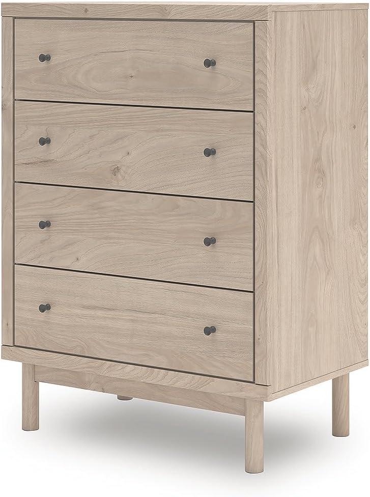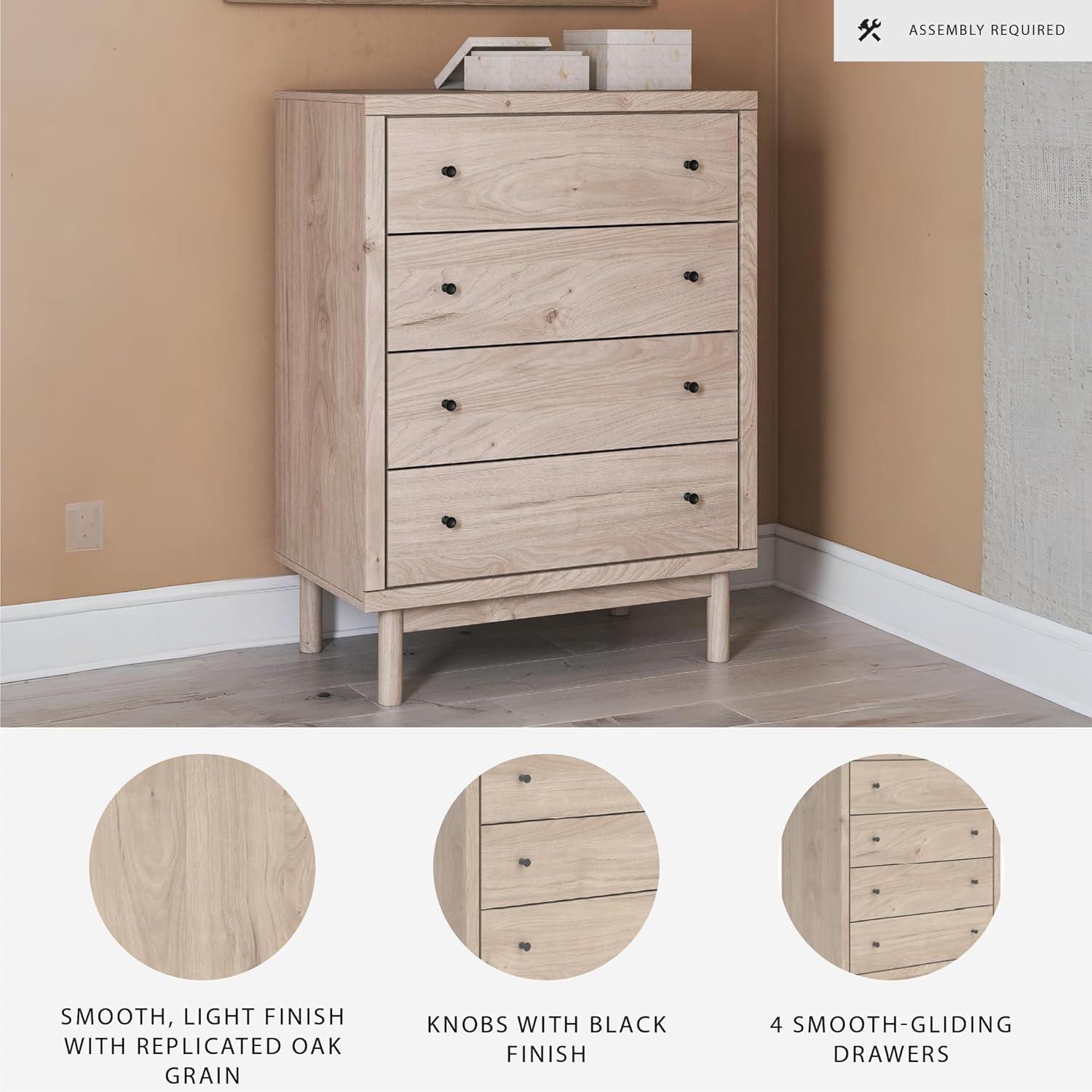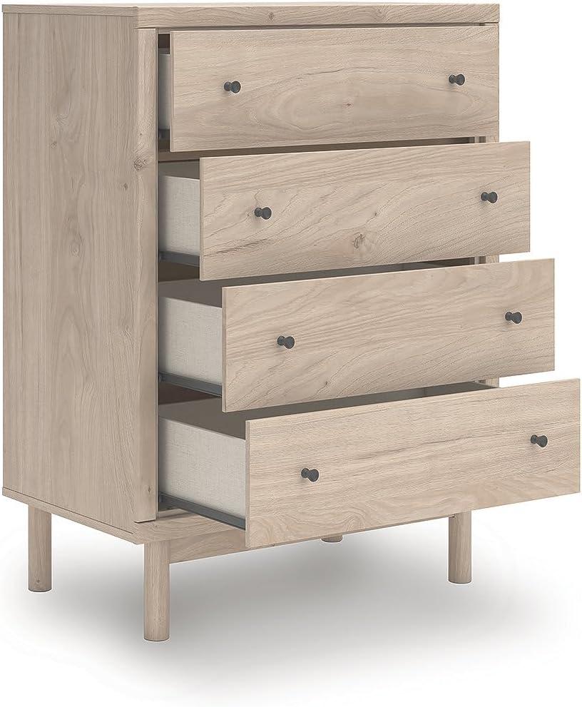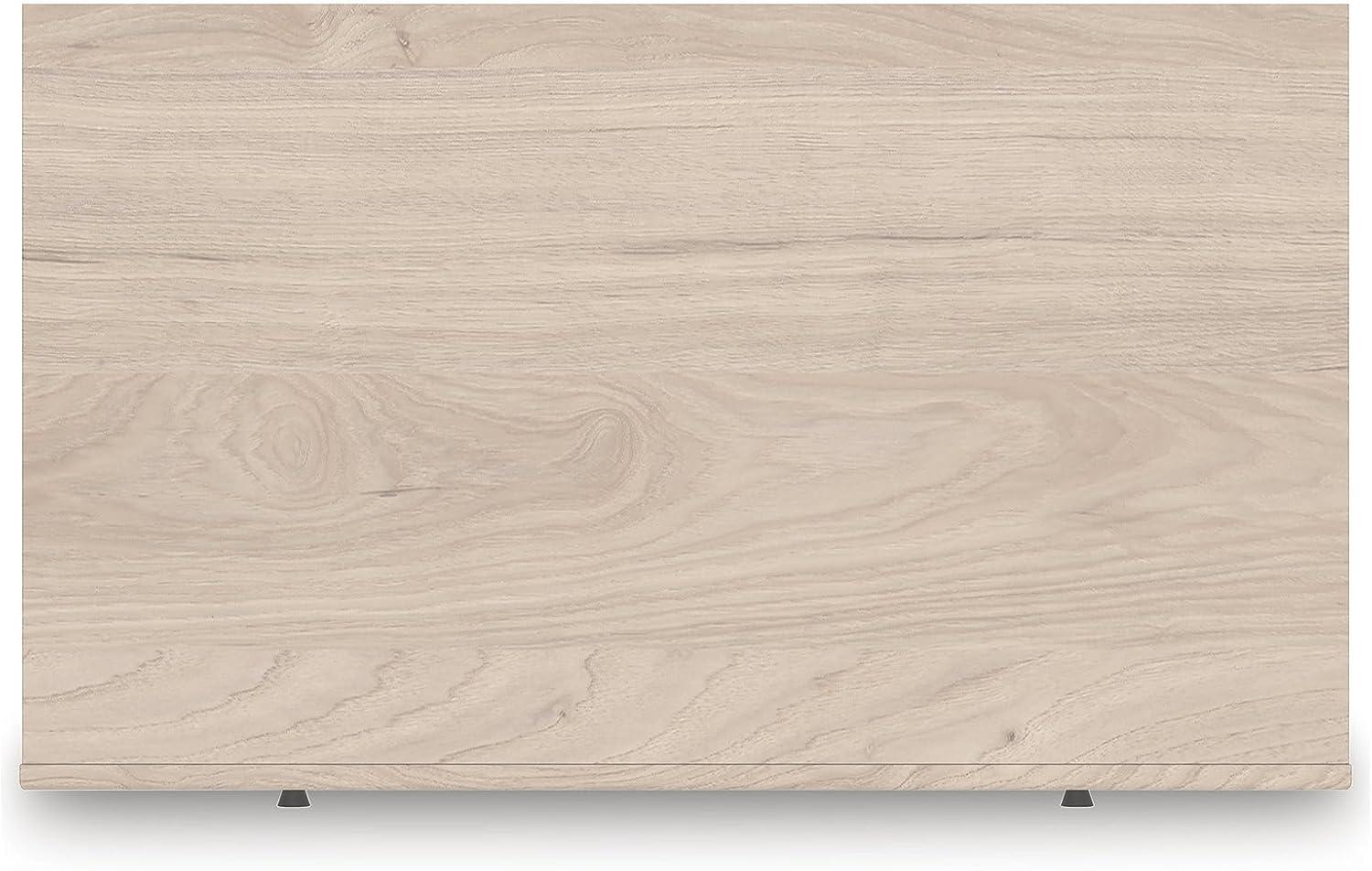 QUALITY CRAFTED: Made with engineered wood and decorative laminate. Smooth, light finish with replicated oak grain. Knobs with black finish. Smooth-gliding drawers lined with faux linen laminate for a clean, finished look