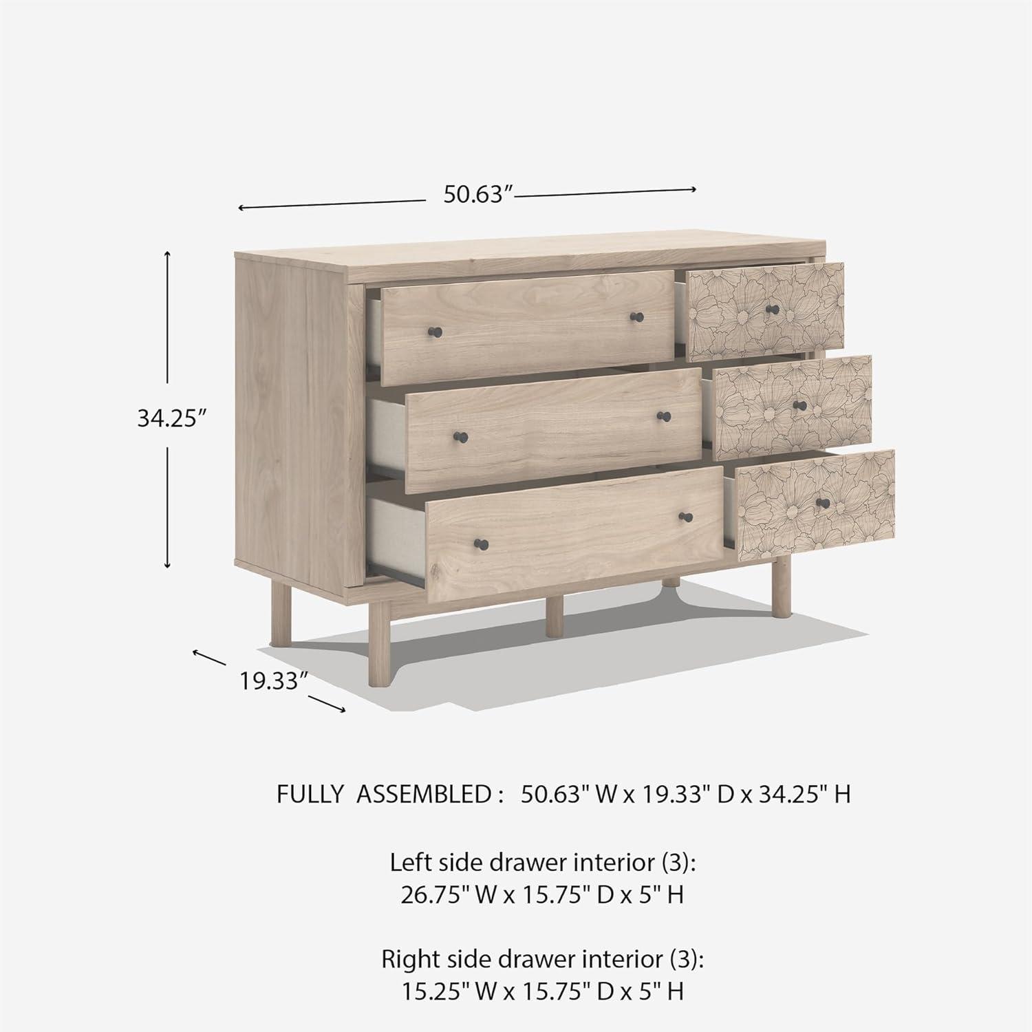 6-DRAWER DRESSER: The charming design and light wood finish of this dresser create a whimsical and inviting atmosphere. Drawers accented with a floral pattern add a free-spirited vibe and plenty of storage. It's both playful and practical