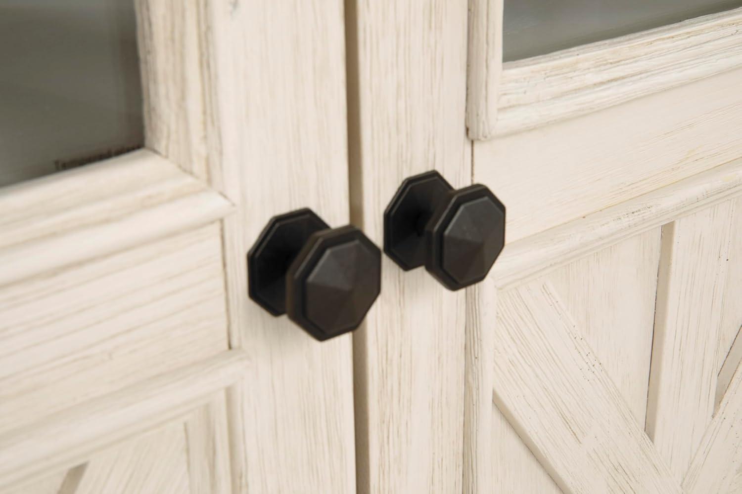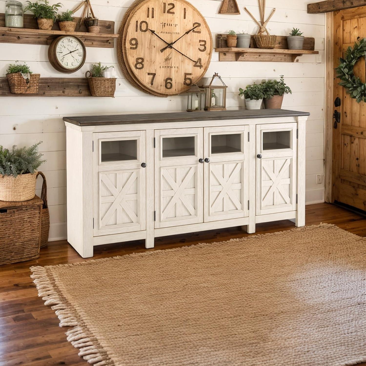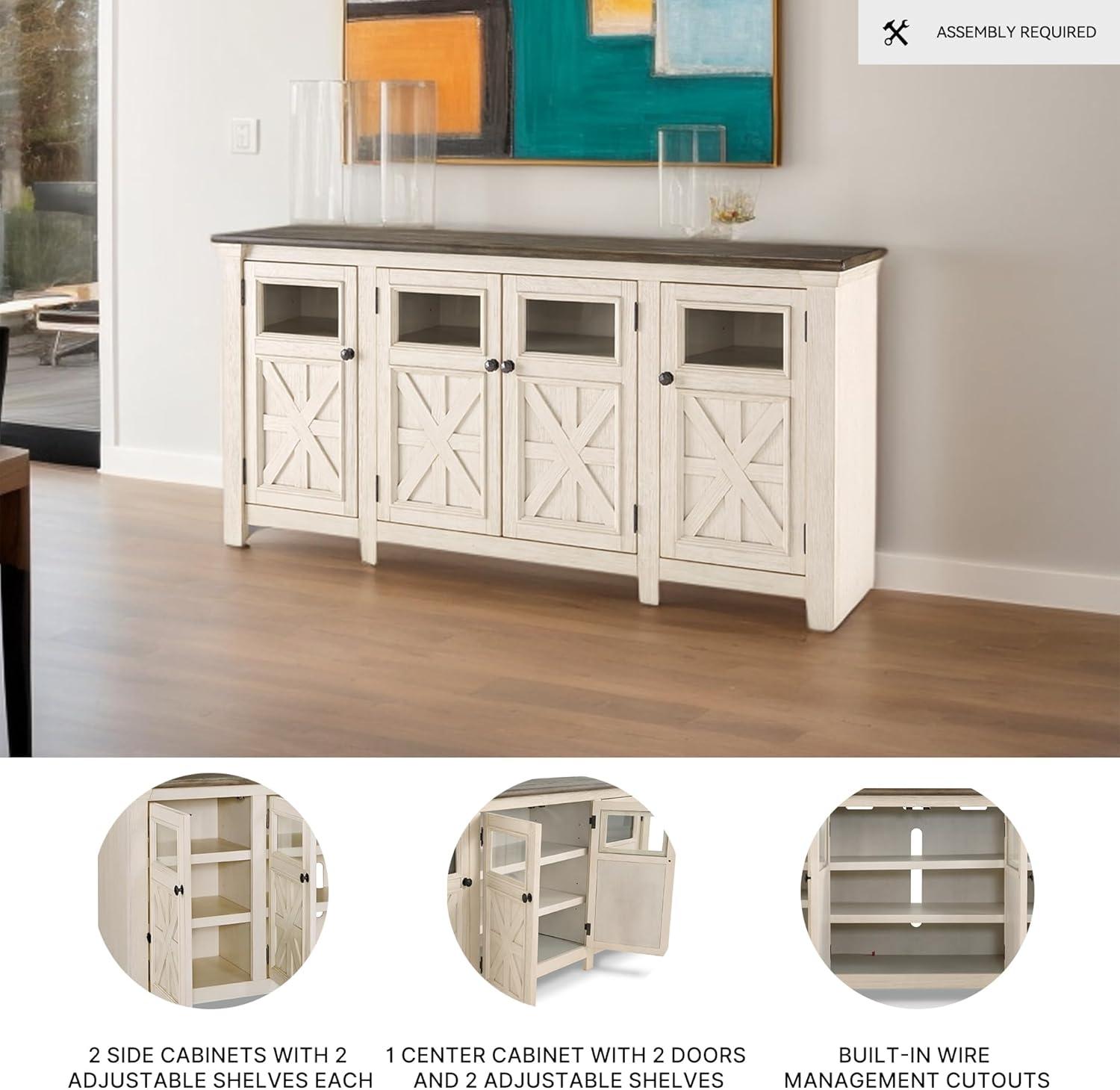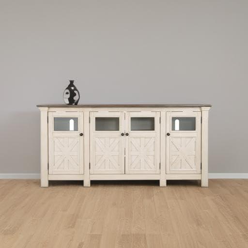 Whether your style is farmhouse fresh, shabby chic or country cottage, you’ll find this extra large TV stand perfectly in tune. Its two-tone, gently distressed finish pairs weathered oak with antique white for that much more quaint character. Charming elements include crossbuck adorned cabinets with glass inlays for peek-through flair. Ample adjustable shelving and cutouts for wire management nicely accommodate your media needs. A stylish TV stand can make your entertaining space a cozy place to relax and recharge. Our entertainment centers provide sturdy support for TVs and other electronics while hiding the wires and cords that could clutter your decor. Whether you're looking for mid-century, farmhouse or other styles, our furnishings include display and storage space, with open and closed-door compartments, drawers and adjustable shelving. And we go the extra mile to package, protect and deliver your purchase in a timely manner.