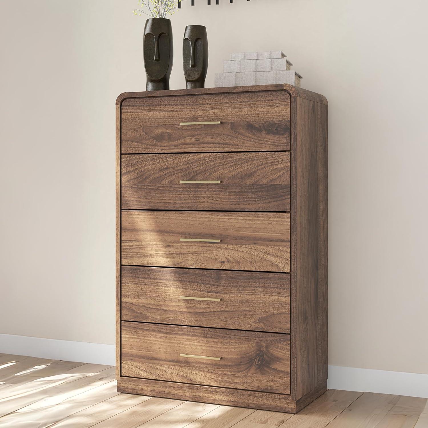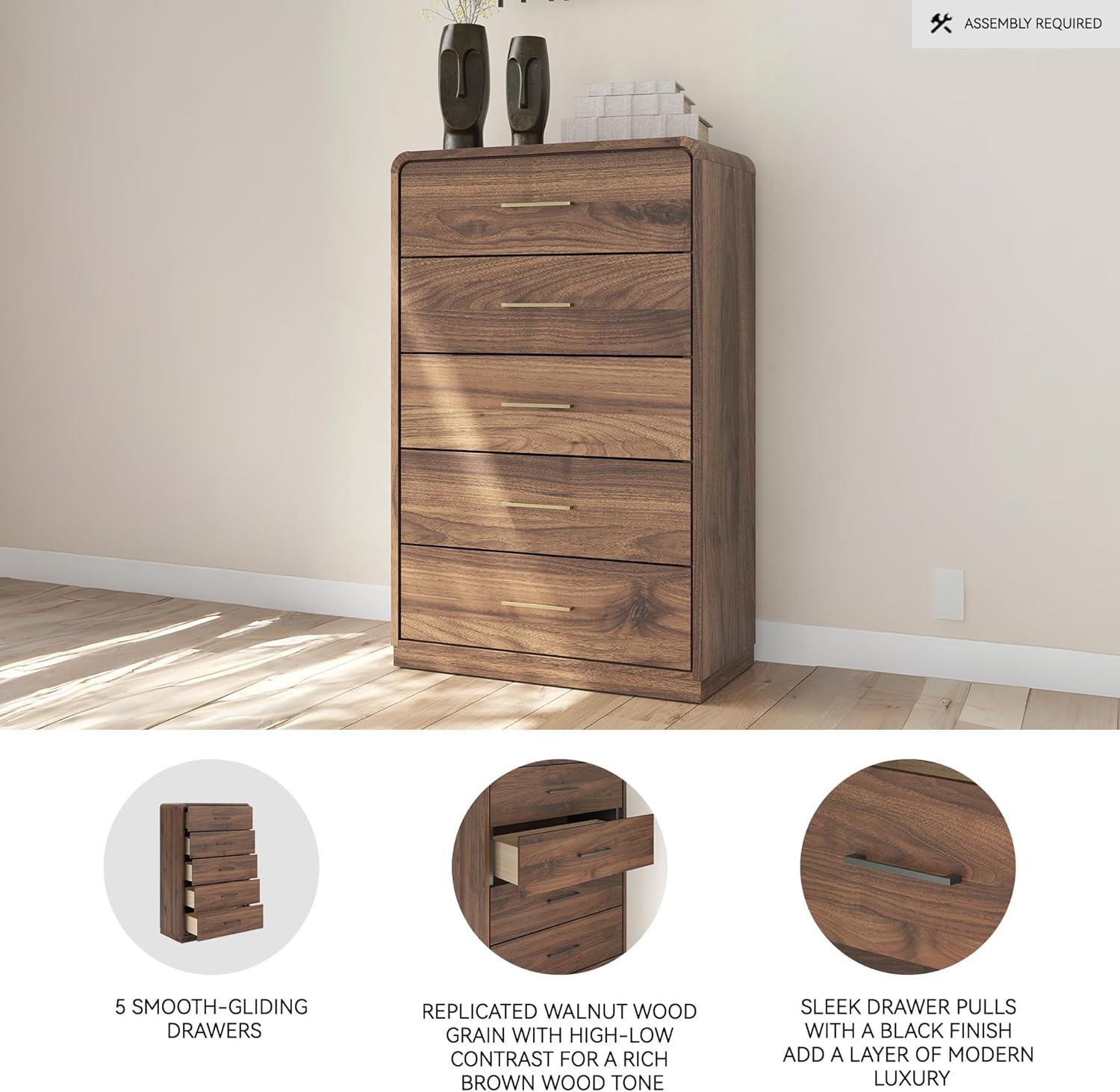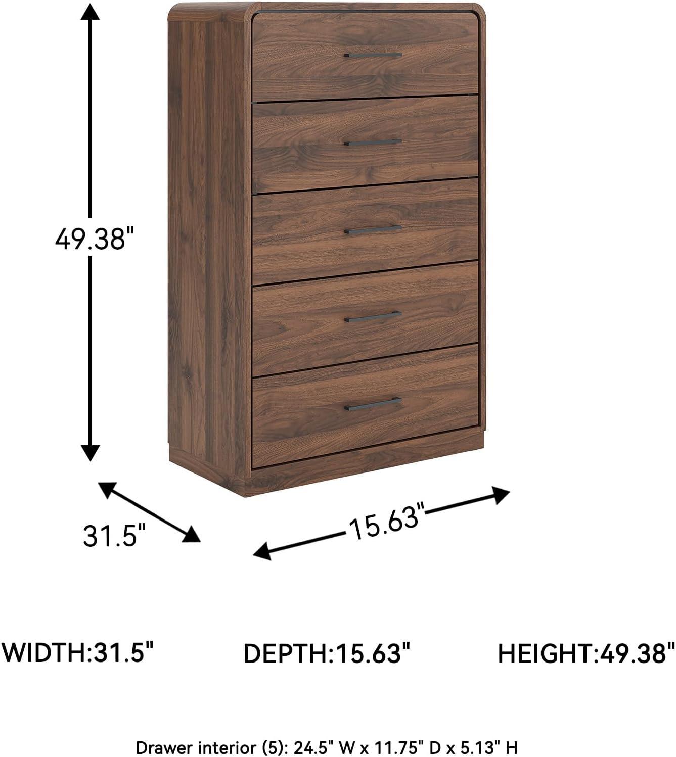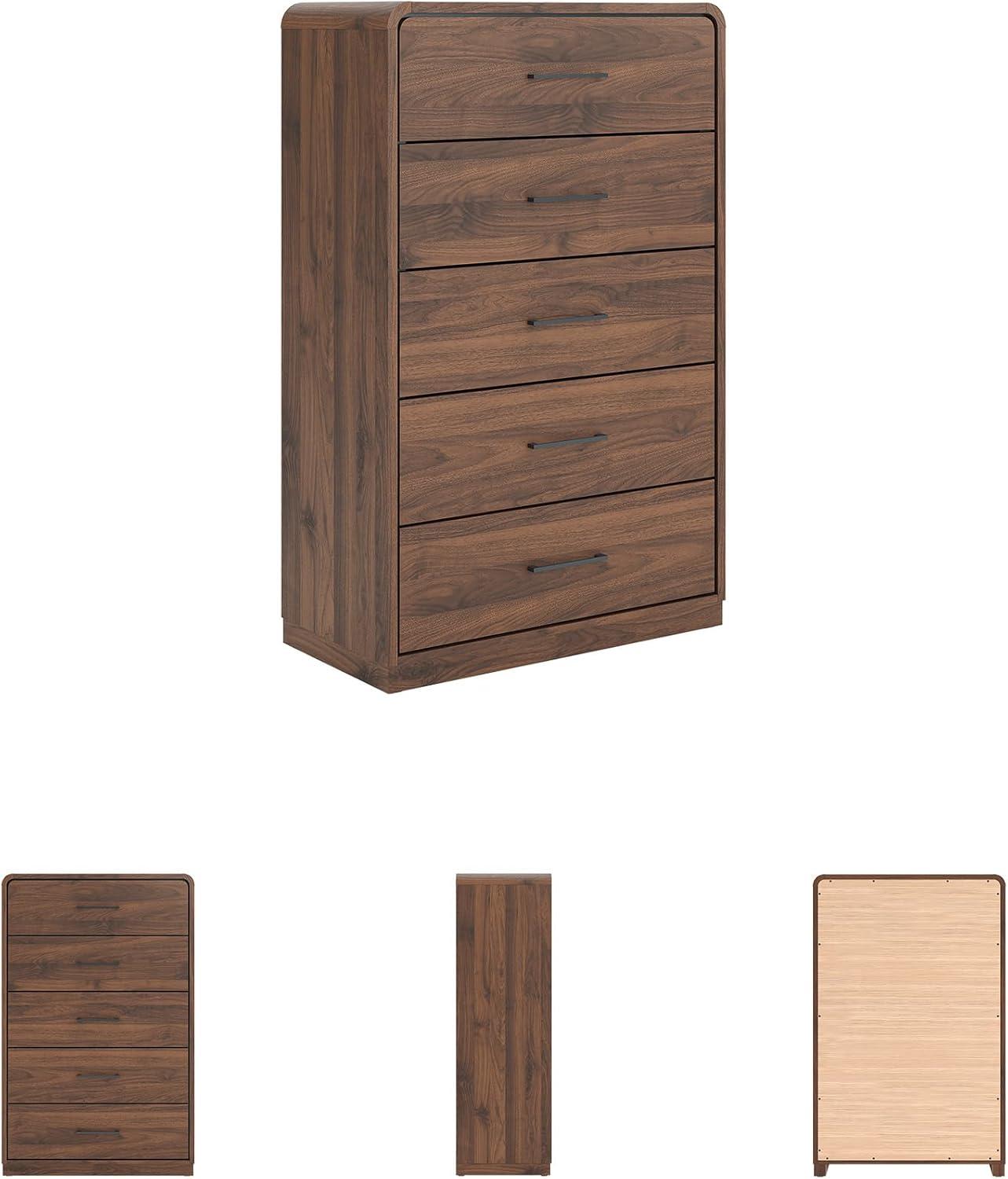 QUALITY MADE: Made of MDF substrates & decorative paper laminate. Replicated walnut wood grain with high-low contrast for a rich brown wood tone. Black finish hardware. 5 smooth-gliding drawers with English dovetail construction & center mount glides