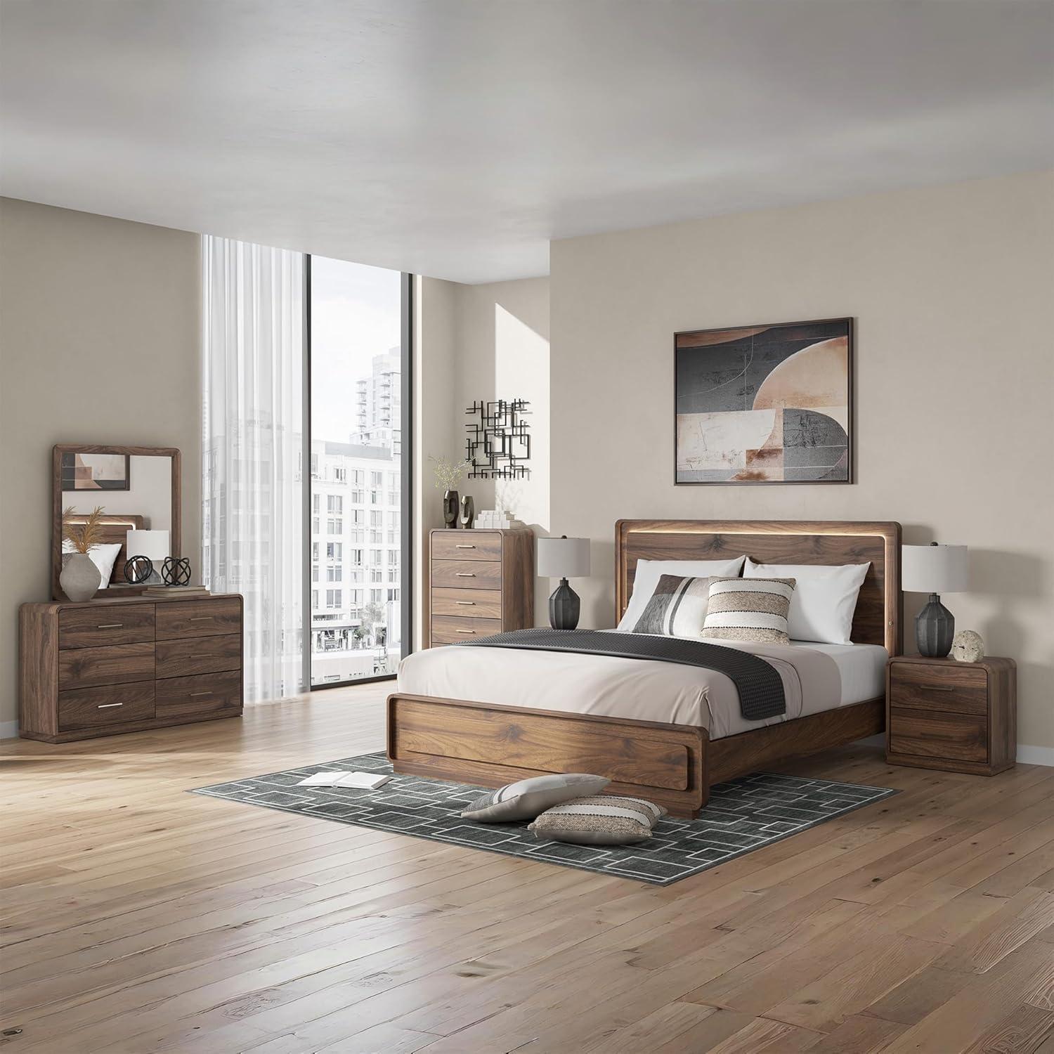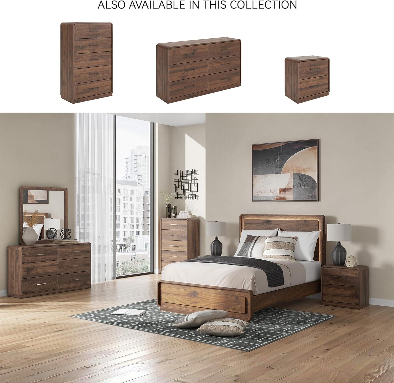 Grace your restful retreat with an added dose of refinement. This chest of drawers showcases a stunning rich brown wood tone, with sleek drawer pulls for an added layer of luxury. A rounded top softens the silhouette, elevating the look. It’s curated, contemporary and utterly chic.
