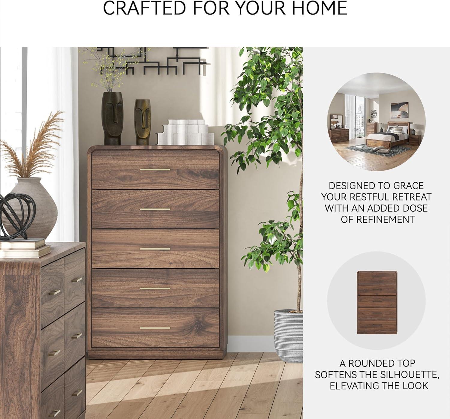 5-DRAWER CHEST: Add refinement to your room. This chest showcases a stunning rich brown wood tone with sleek drawer pulls for added luxury. A rounded top softens the silhouette, elevating the look. It’s curated, contemporary and utterly chic