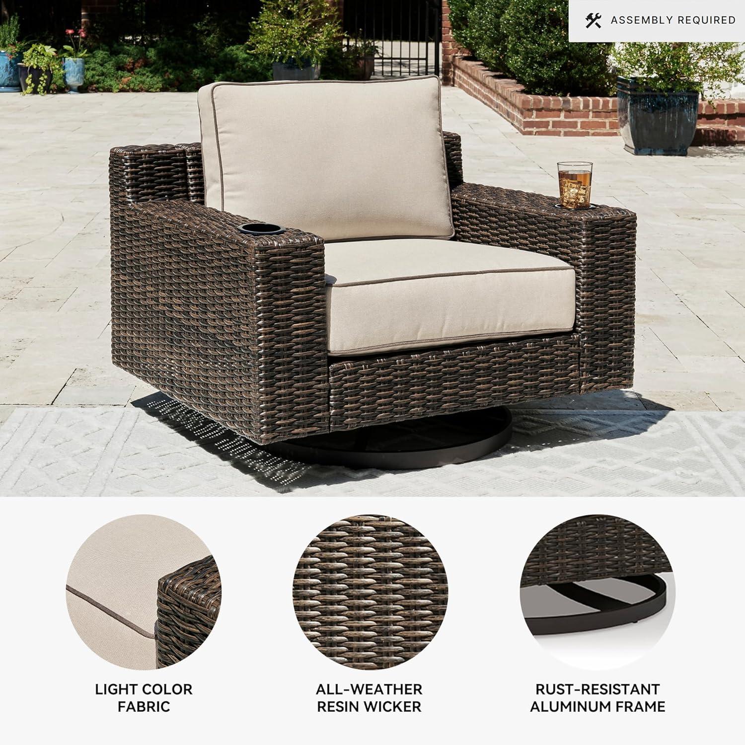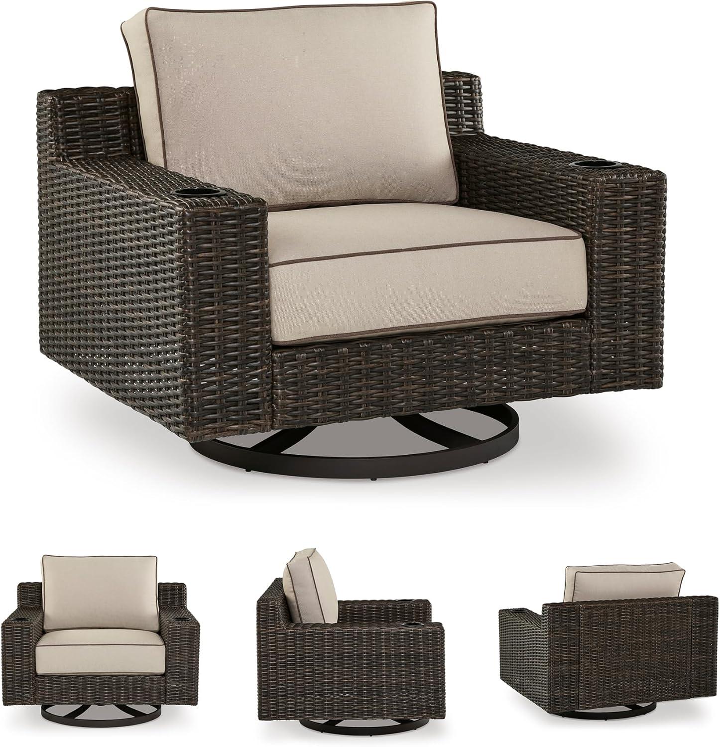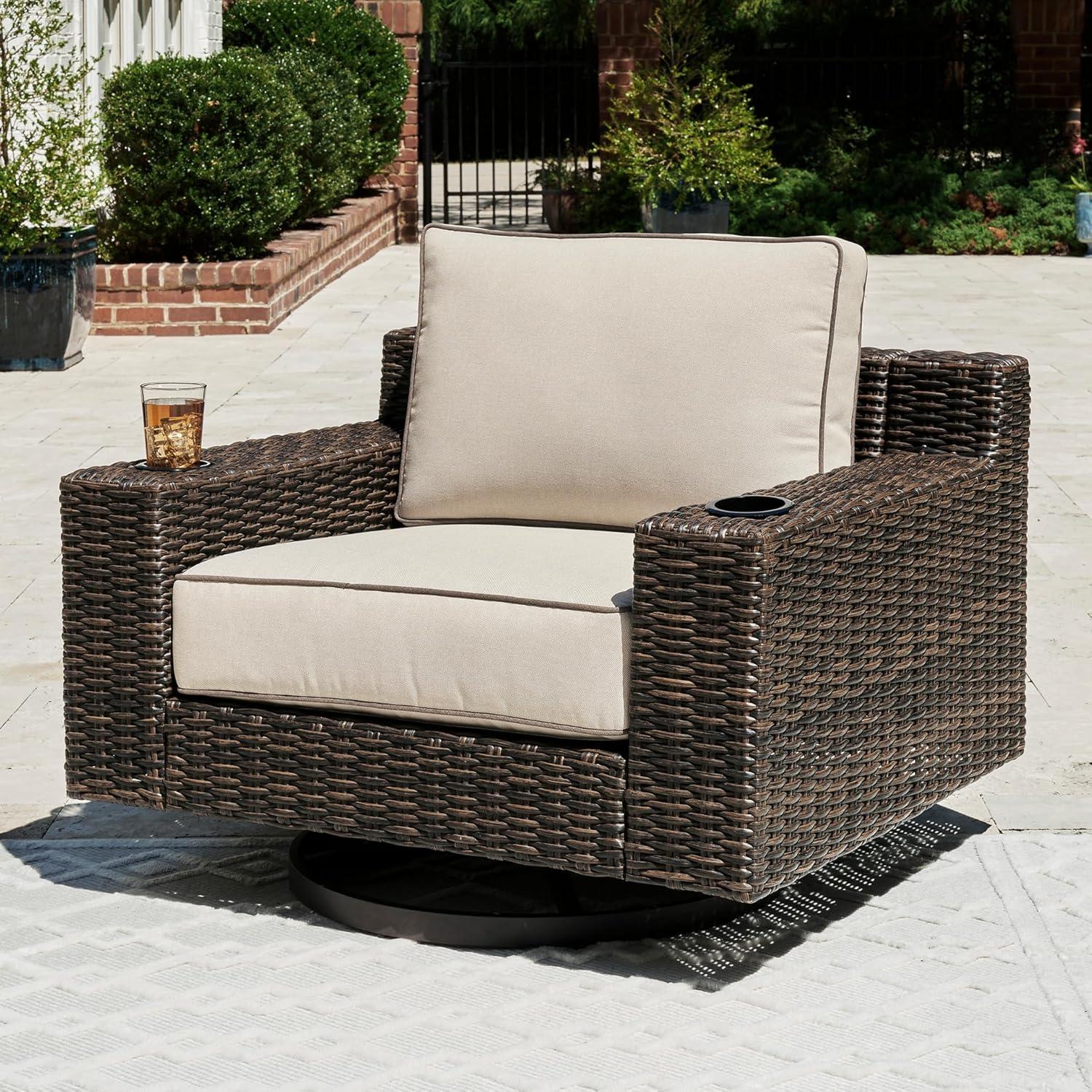 Signature Design by Ashley Coastline Bay Casual Outdoor Swivel Lounge with Cushion and 2 Cup Holders, Nuvella Weather Resistant Fabric, Beige & Dark Brown(Outdoor Swivel Lounge with Cushion)