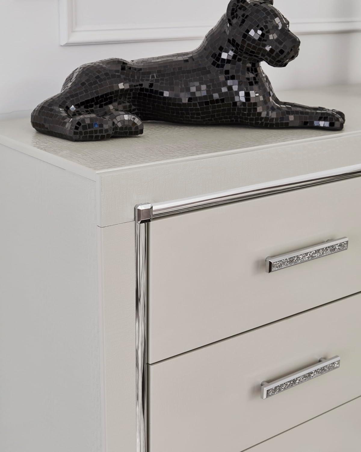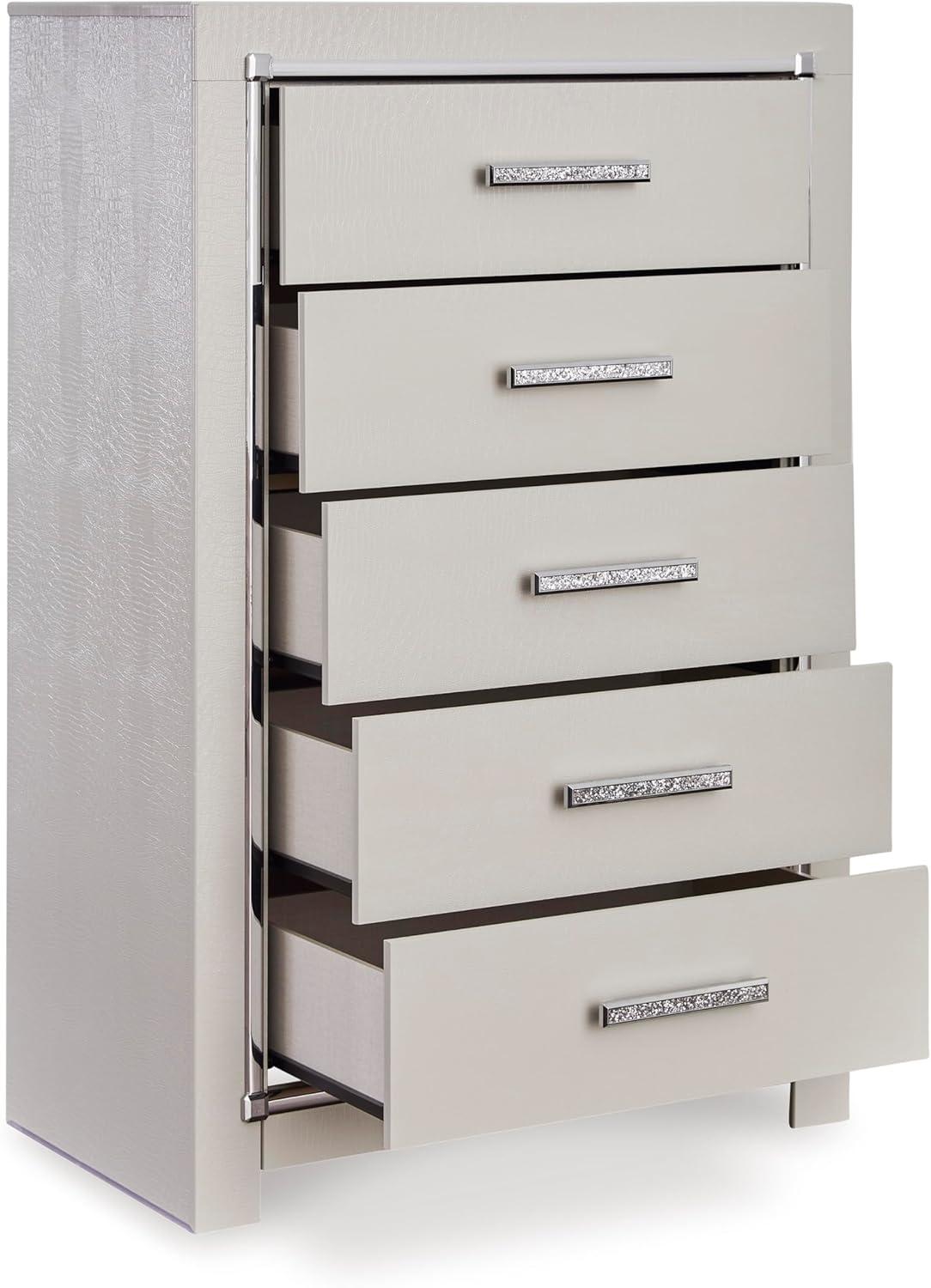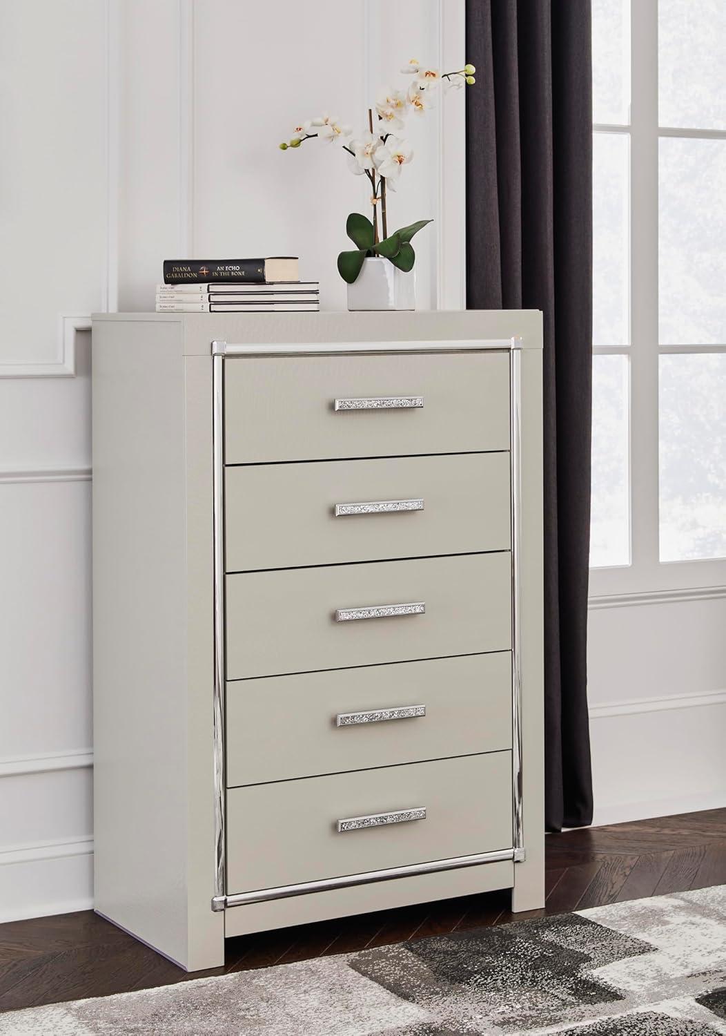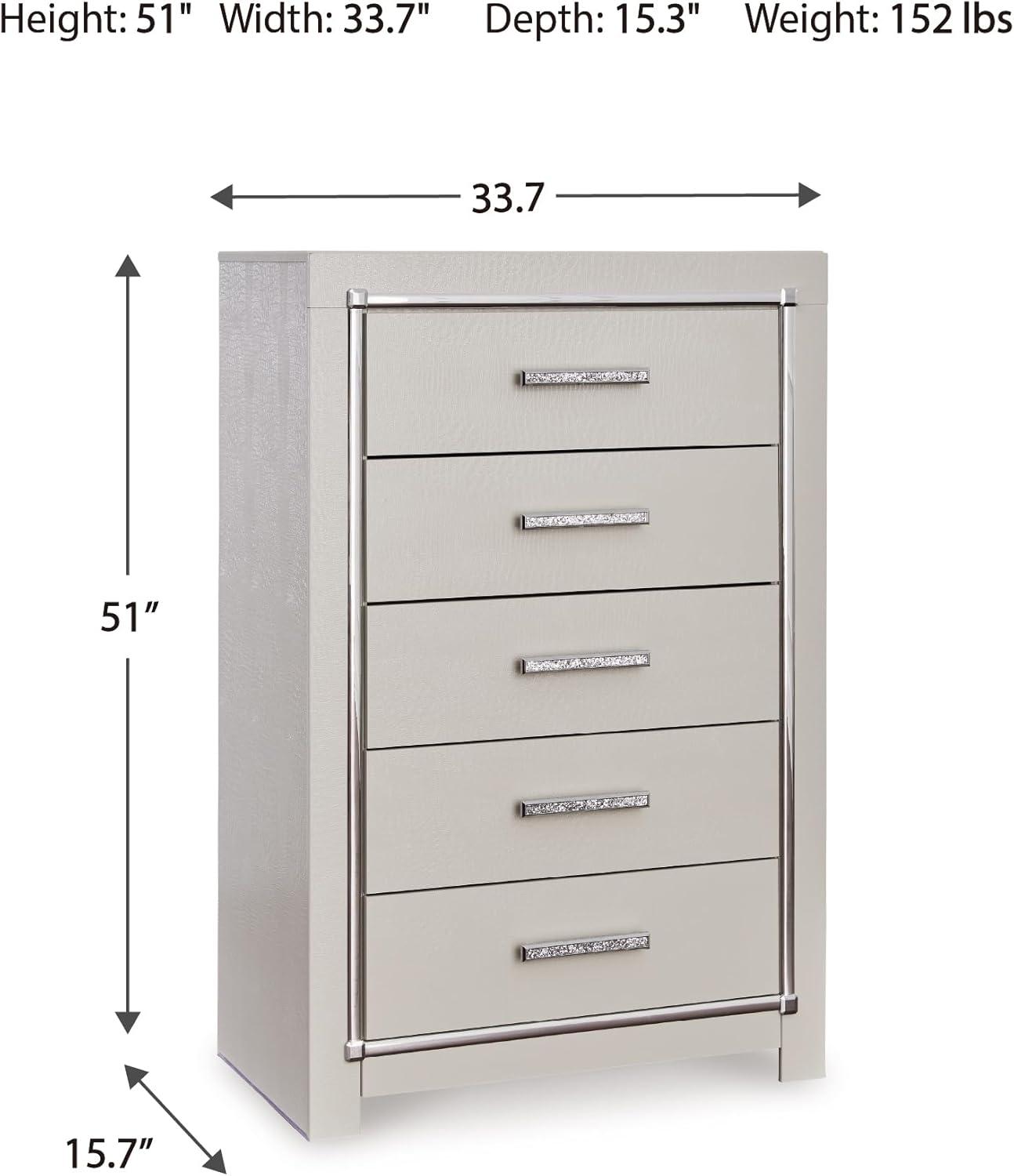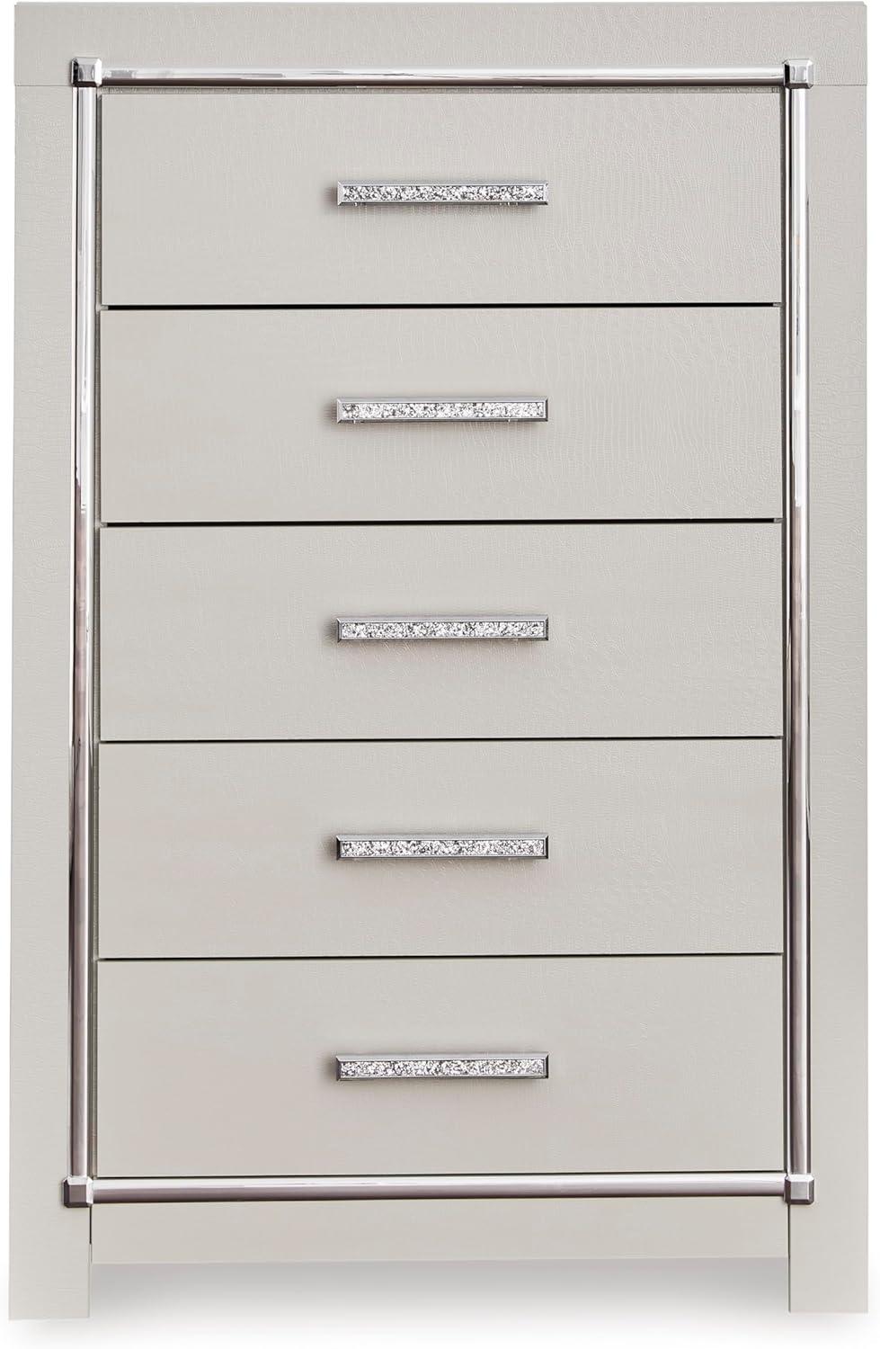 Signature Design by Ashley Lodanna Modern Glam 5 Drawer Chest, Faceted Chrome-tone Pulls and Accents, Wood, 33.75″ Wide x 15.75″ Deep x 51″ High, Gray(Chrome)