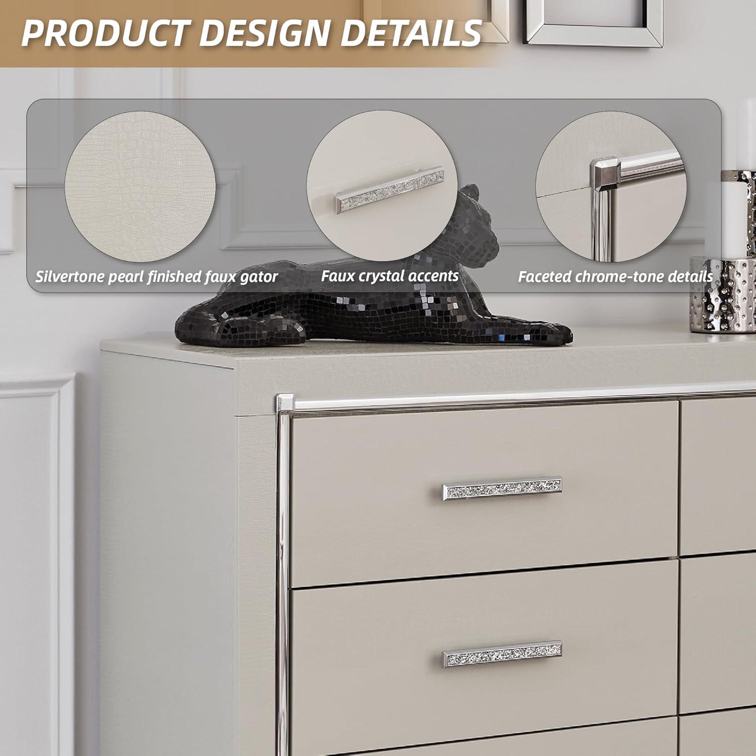 ALL IN THE DETAILS: Dazzling gray finish and faceted chrome-tone accents, while five smooth-gliding drawers provide enough storage to appease your inner diva