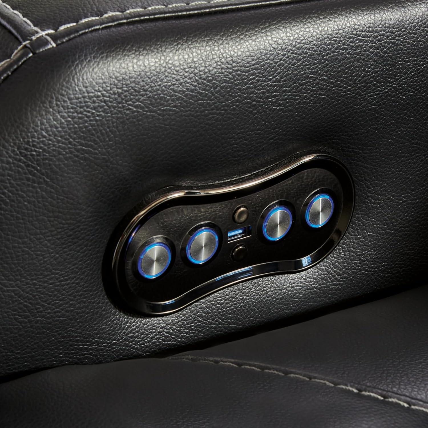 MODERN COMFORT: Sleek sofa includes wireless and USB charging, adjustable headrests and extended “zero-gravity” ottomans. Drop-down table with storage, reading lights and 2-stage cupholders