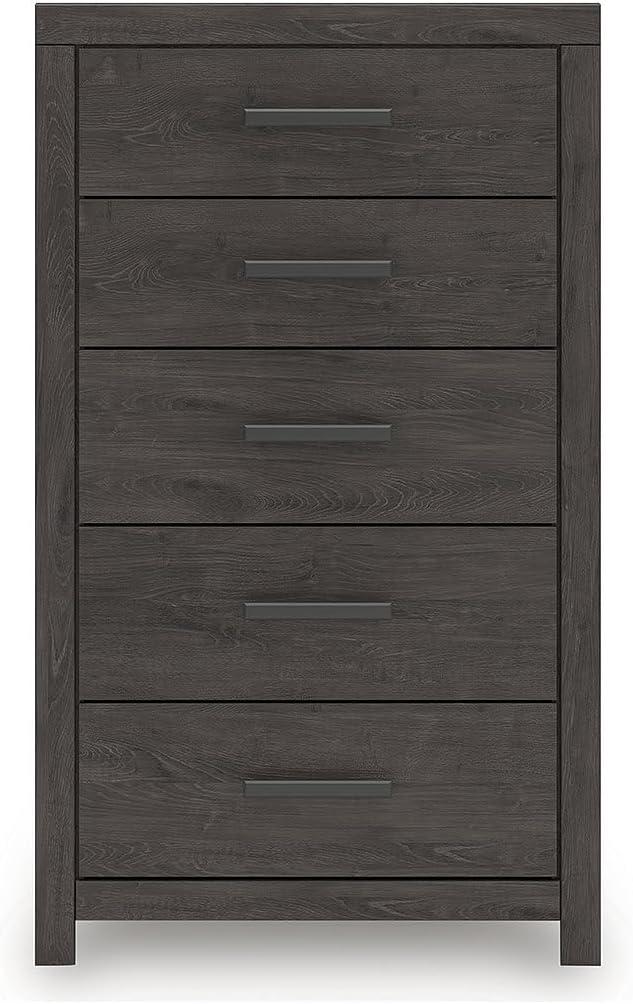 QUALITY CRAFTED: Made with engineered wood and decorative laminate. Dark charcoal finish over replicated oak grain. Large black handles. 5 smooth-gliding drawers. Framed front and pilasters
