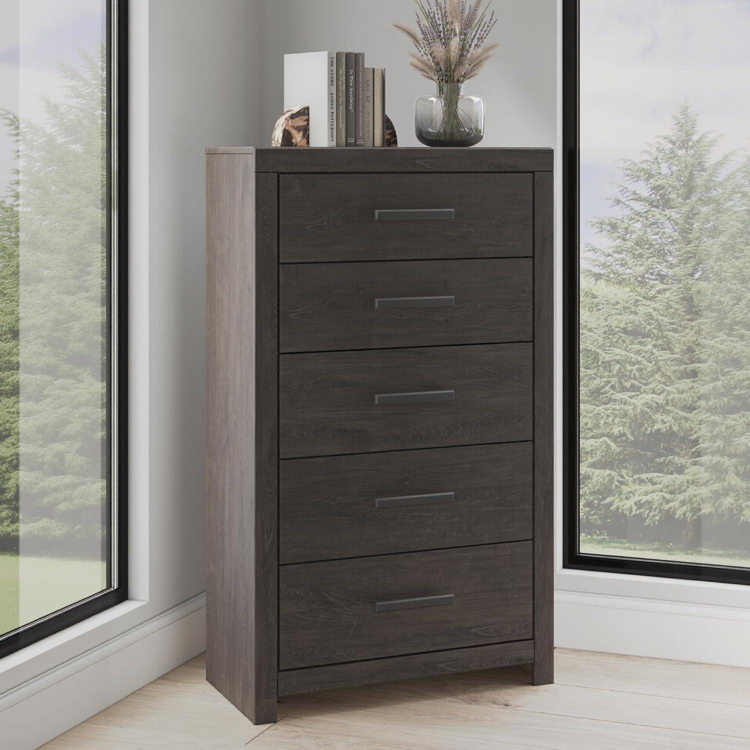 Designed with everyday style in mind, this chest of drawers is a simply chic approach to modern living. A dark charcoal finish blends black and brown undertones, creating a versatile look that effortlessly pairs with your existing pieces. And for must-have function, five smooth-gliding drawers store clothes and linens in charming fashion.