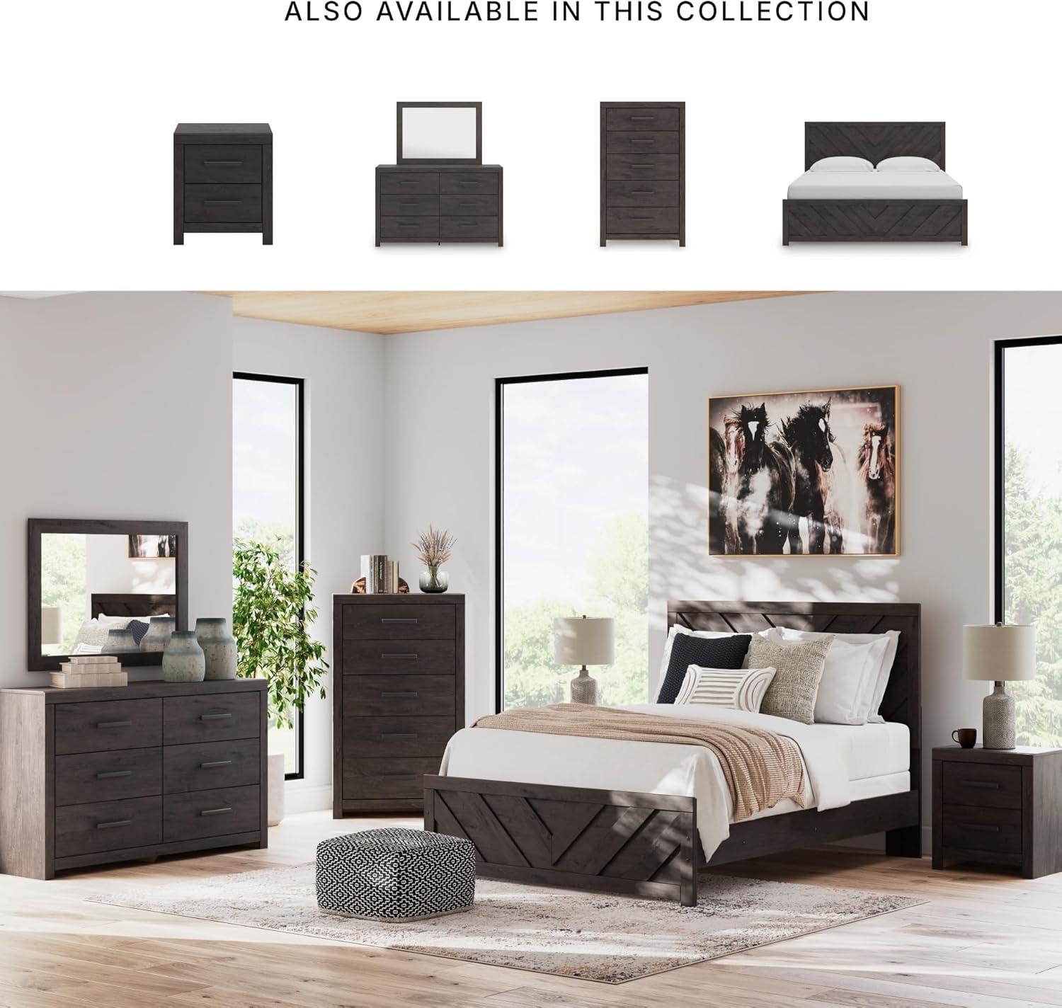 5-DRAWER CHEST: Designed for everyday style, this chest is a chic approach to modern living. A dark charcoal finish blends black and brown undertones for a versatile look. Five smooth-gliding drawers store clothes and linens in charming fashion