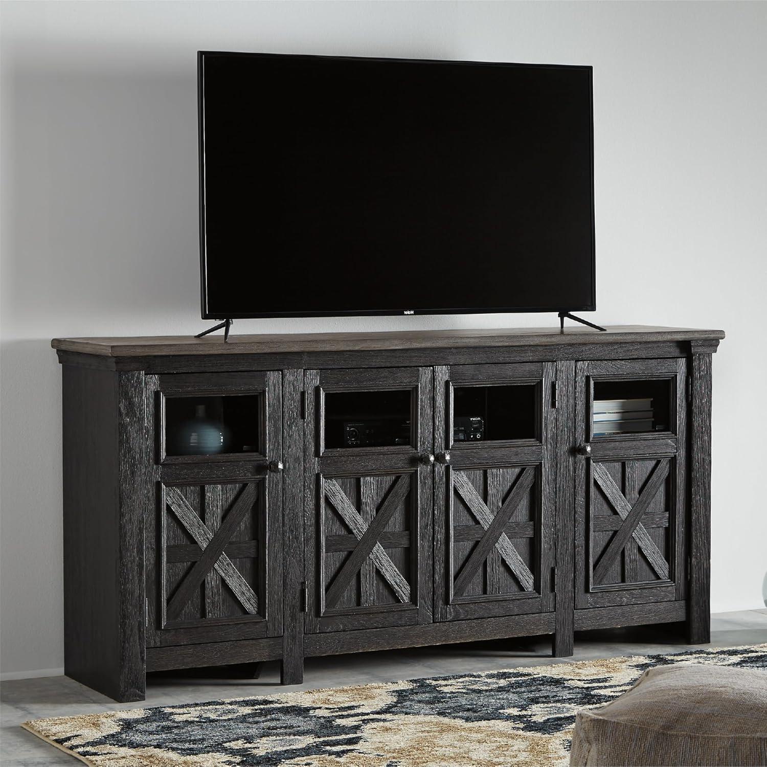 Shabby chic with a hint of down home country is what gives this TV stand standout style. Appealing to today’s more relaxed sensibilities, its richly rustic two-tone effect blends a textured black finish with a weathered gray-brown top for an easy-elegant aesthetic. Framed doors with crossbuck detailing and clear glass insets bring a touch of modern farmhouse to the scene. A stylish TV stand can make your entertaining space a cozy place to relax and recharge. Our entertainment centers provide sturdy support for TVs and other electronics while hiding the wires and cords that could clutter your decor. Whether you're looking for mid-century, farmhouse or other styles, our furnishings include display and storage space, with open and closed-door compartments, drawers and adjustable shelving. And we go the extra mile to package, protect and deliver your purchase in a timely manner.